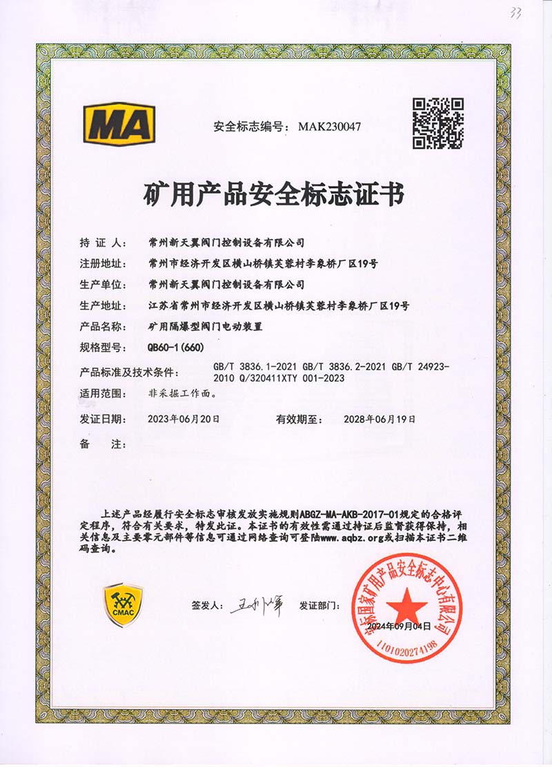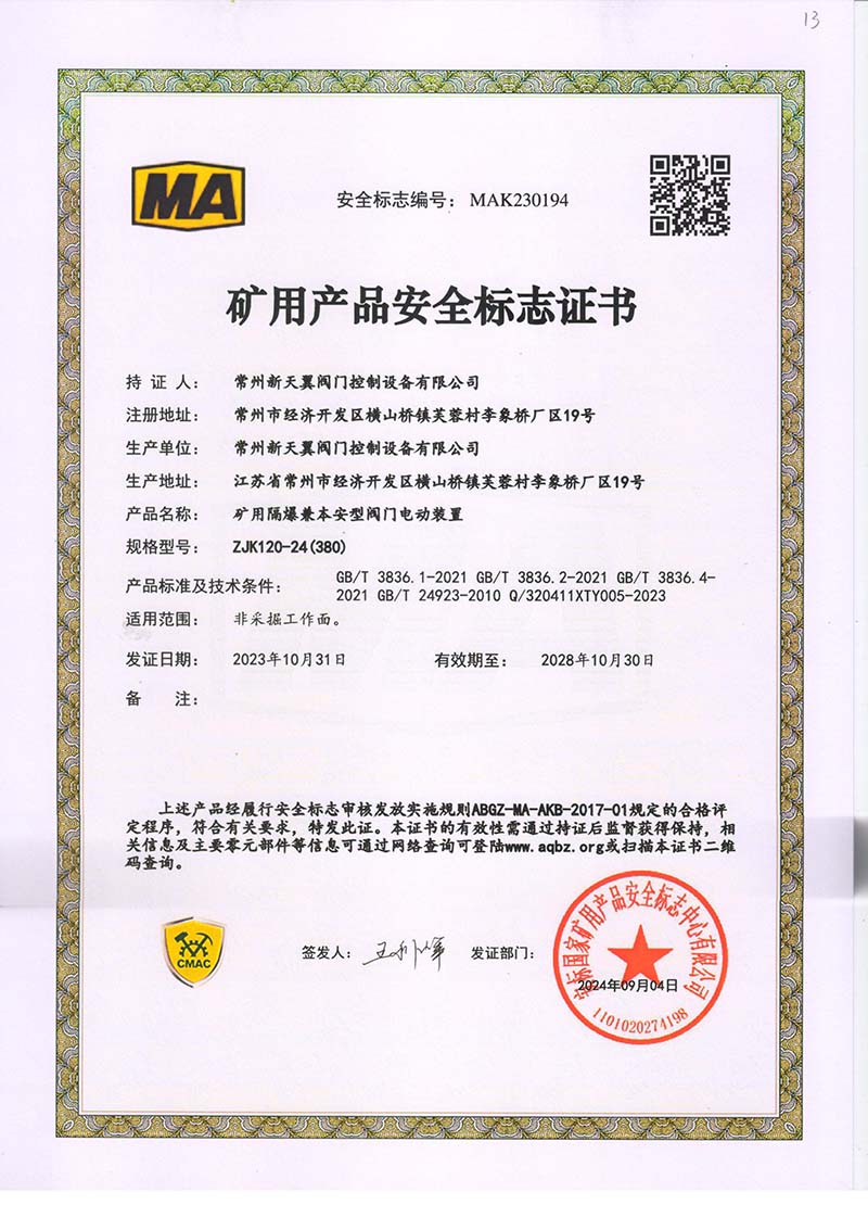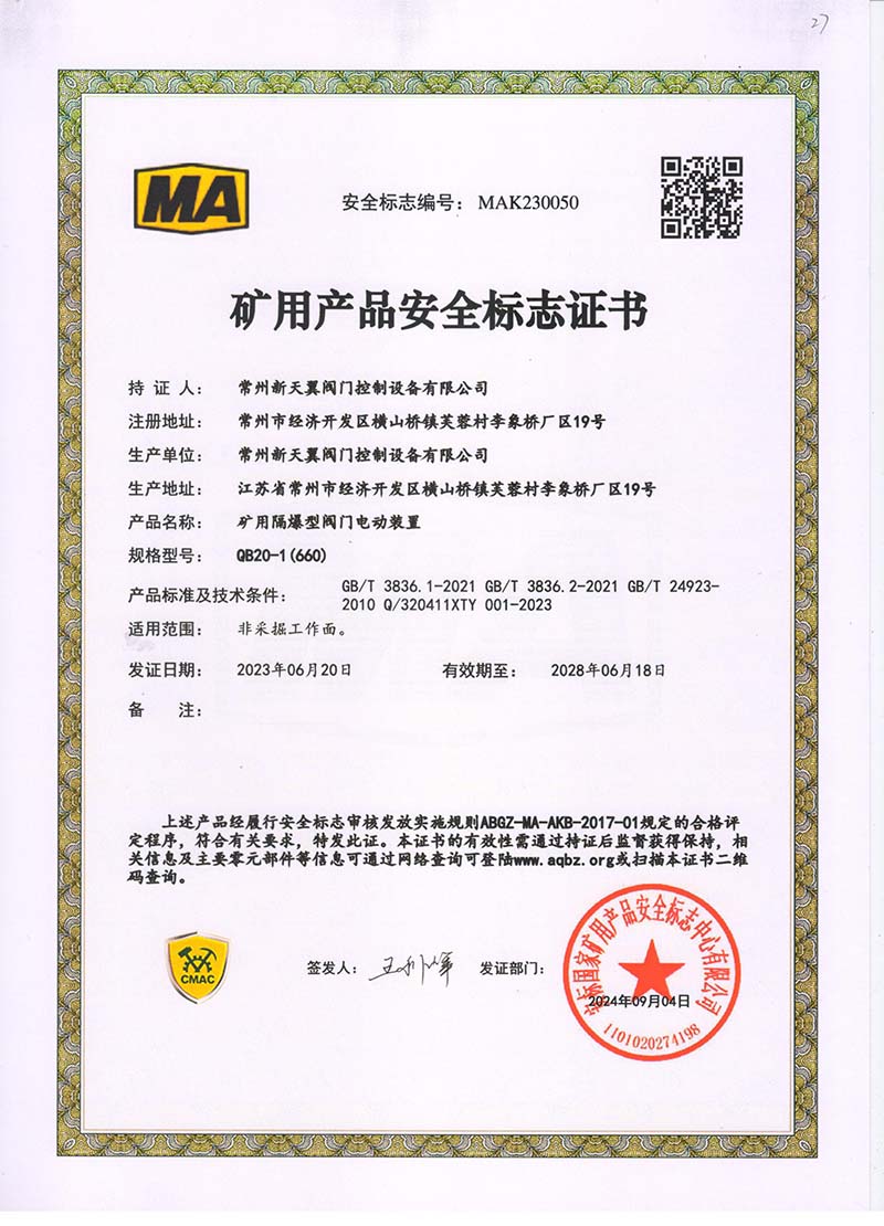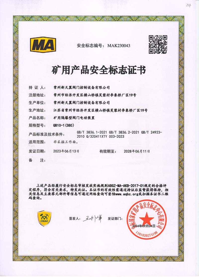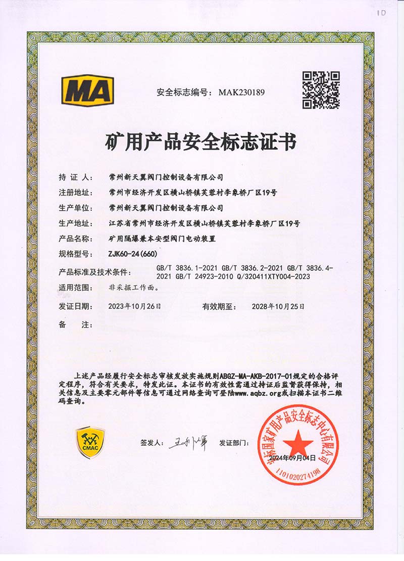 礦用隔爆ZB10-24中國國家強制性產品認證證書110.1