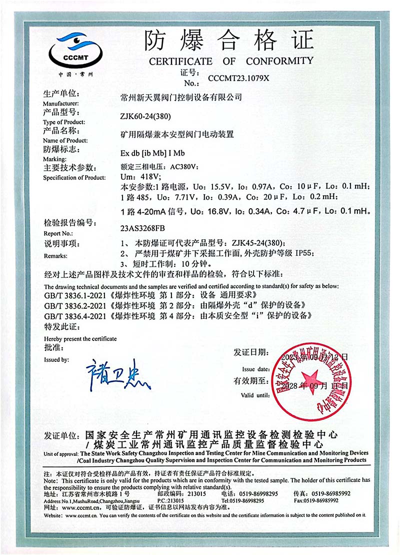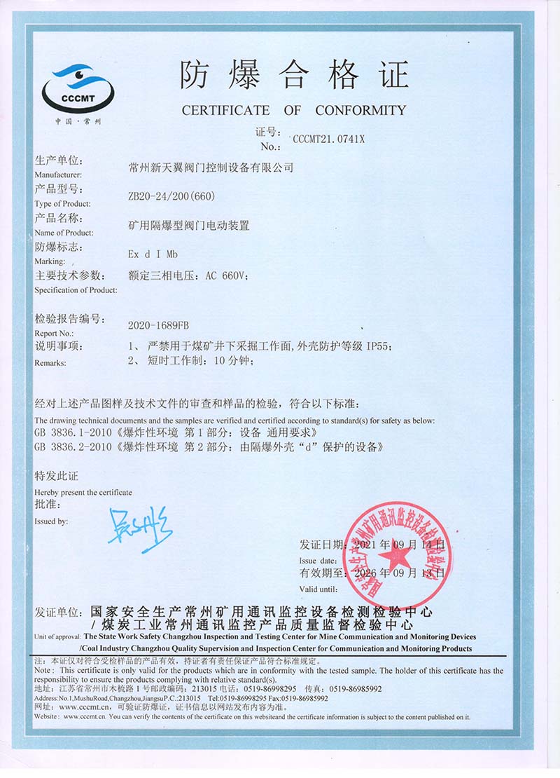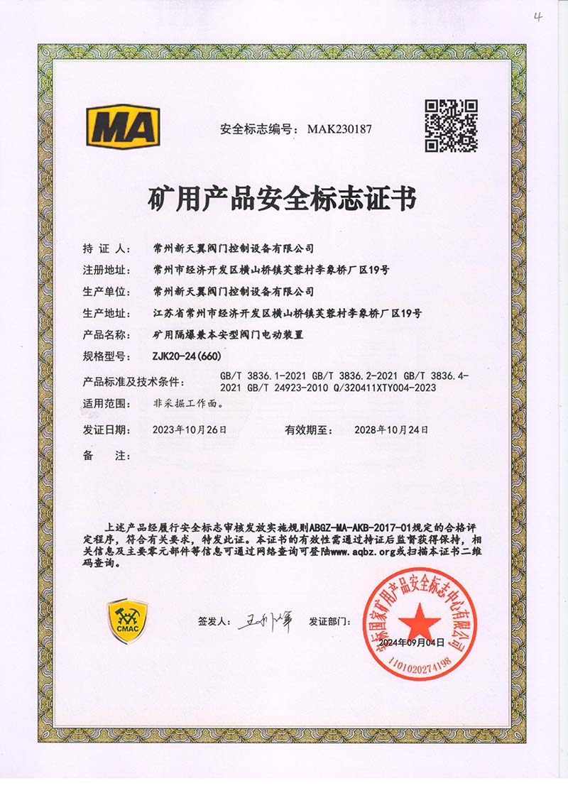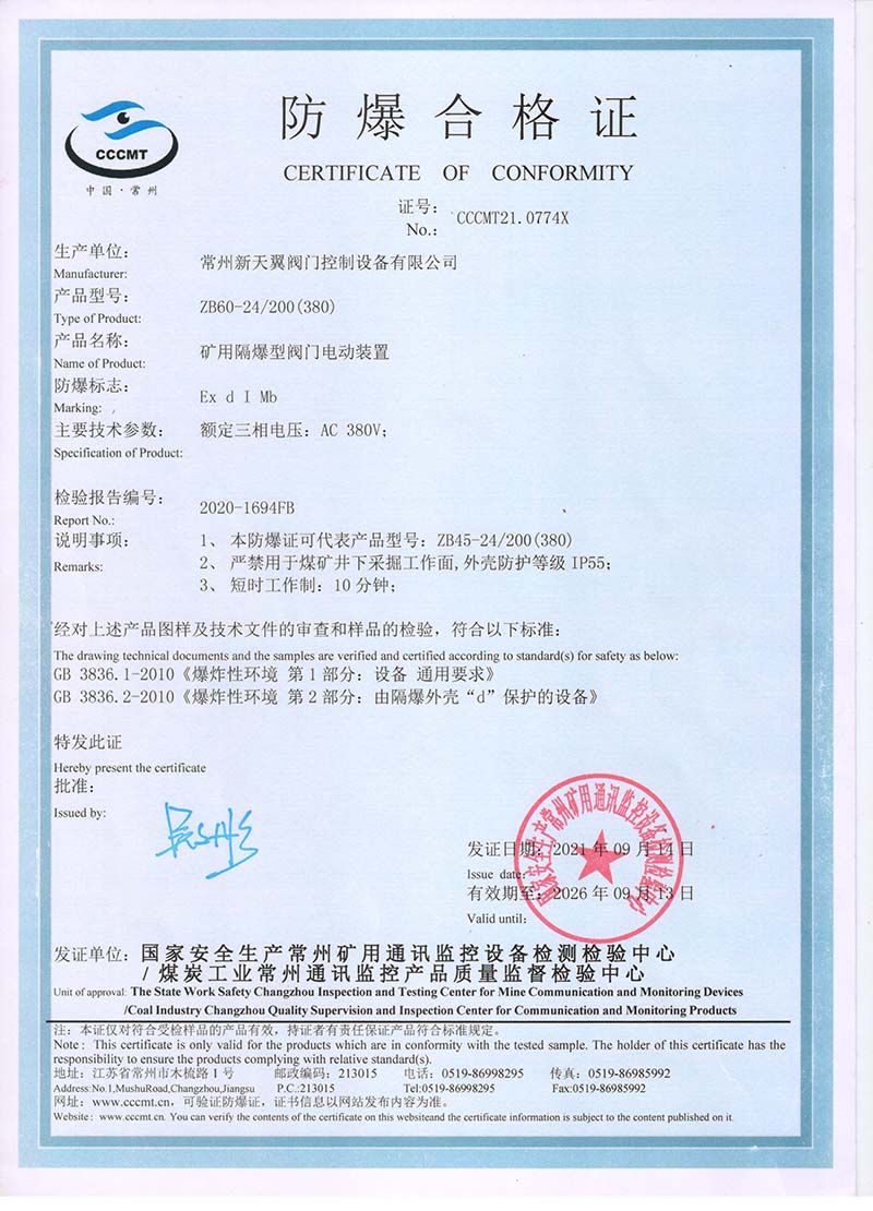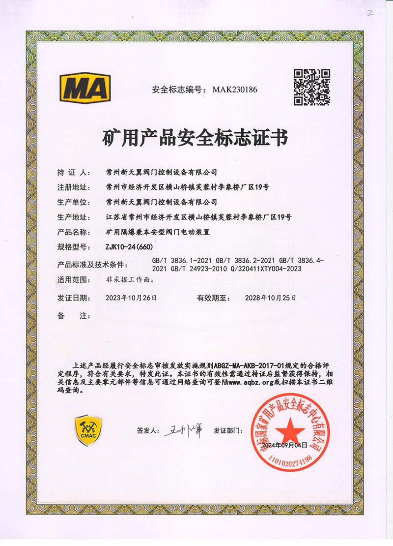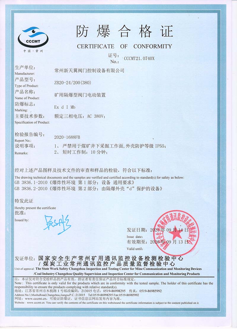 礦用隔爆ZB10-24中國國家強制性產品認證證書110.2
