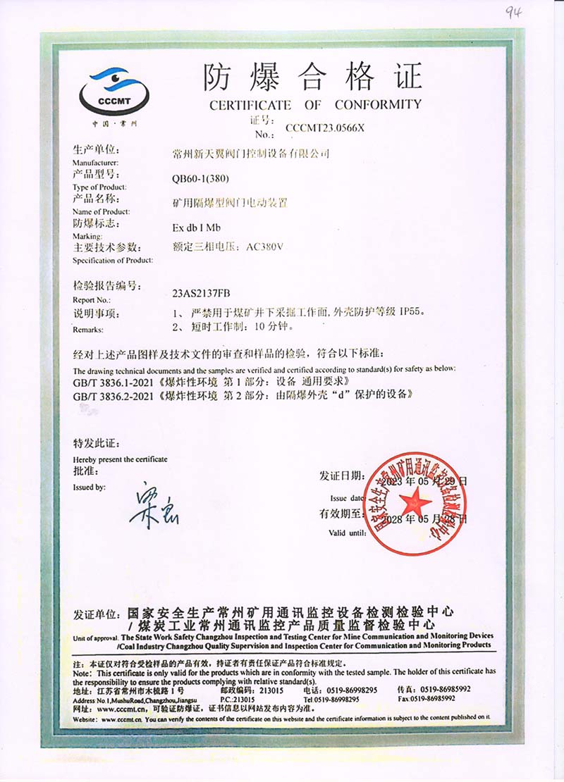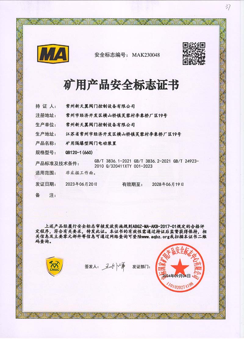 礦用隔爆QB127V中國國家強制性產品認證證書105.2