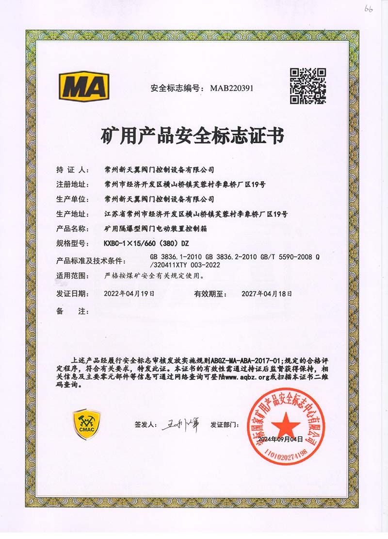 礦用產品安全標志證書KXBC-1 15 660(380)DZ